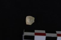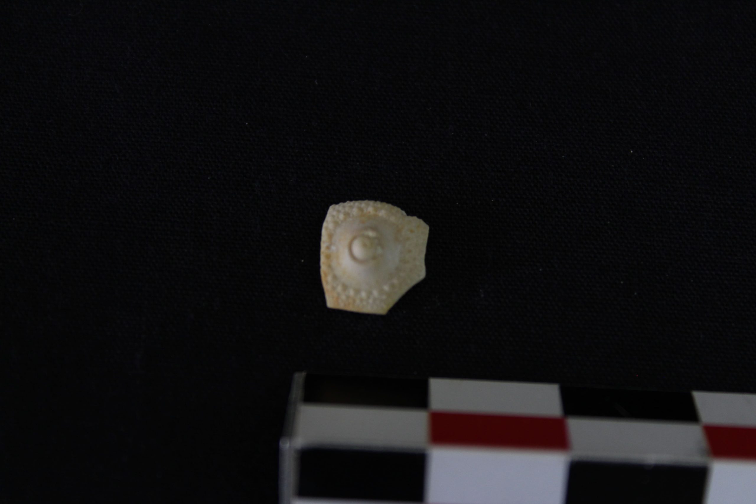 Fragmento de carapaça de ouriço do mar. A peça é achatada, com uma protuberância de encaixe do espinho preservada. Possui ornamentações da carapaça preservadas, além de borda serrilhada para encaixe no restante da carapaça. Possui textura rugosa e coloração bege.